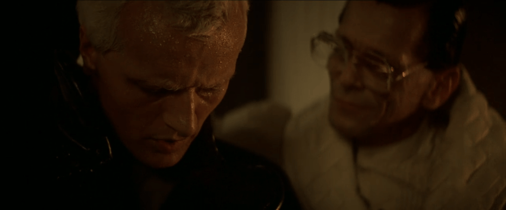 Roy lamenta ante Tyrrell haber hecho cosas malas, pero le replica que también cosas extraordinarias. Vemos cómo de nuevo Roy pasa de mostrar tristeza o arrepentimiento a sonreír o mostrar sorna. Se debate entre unos sentimientos y otros, como ya habíamos visto y seguiremos viendo. Sin embargo, Tyrrell subraya sólo sus logros. Parece estar orgulloso de él, pero en tanto que es una creación suya. En realidad Tyrrell sólo está orgulloso de sí mismo. No presta atención ni le importa que a Roy le preocupe la muerte. Le dice que es el hijo pródigo, que es todo un premio. Tyrrell sólo piensa en sí mismo. Lo invita a deleitarse con su tiempo. Lo invita a ser el egoísta superficial que es él mismo. Vemos fugazmente a JF Sebastian mostrar una leve sonrisa de orgullo también desde su rincón, aunque parece por momentos dubitativo, como sabiendo que hay algo terrible en todo esto. Tyrrell no concibe la dimensión espiritual de los seres que crea, como el falso Dios que es sólo de la biología, de lo material. Ámbito dentro del cual tampoco tiene todo el poder, entre otras cosas porque le falta totalmente el conocimiento del lado espiritual.