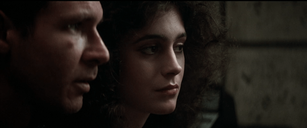 «Bésame», le dice Deckard a Rachael. «No puedo fiarme de mi memoria», responde Rachael. Y entonces Deckard le pide que sea ella quien le pida a él que la bese y le diga que lo desea. Y ella ya añade más deseos que salen de ella referidos a él. Vemos aquí la idea de la mujer como ser puro, amoroso y salvífico pero a la vez pasivo y lleno de dudas, y empujado por el hombre al sexo y a expresar sus deseos. A él le cuesta reconocer sus sentimientos, porque le dice que no la mataría como parte de su trabajo porque le debe la vida – cuando en realidad es porque la ama. Como dicen los red pillers, católicos del ala conservadora, al hombre sí que le importa el pasado de una mujer, pero a ella no le importa el pasado. Ni el del hombre ni el suyo propio. Por eso da igual si los recuerdos de Rachael son falsos ahora que tiene ante sí a Deckard, y éste consigue que se desprenda de ellos.
