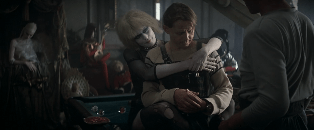 Pris está en casa de JF Sebastian y se pinta la cara de blanco como las maniquíes torpemente animadas de JF. No es casualidad que nos muestren así a Pris, replicante diseñada para el sexo, como contraste con la pureza pasiva y sincera de Rachael. JF le dice a Pris que tiene el síndrome de Matusalén, aunque lo explica como que envejece más rápido de lo normal (ese síndrome consiste en parecer más joven, según he consultado, pero bueno). En todo caso, tiene algo en común con los replicantes, una vida más corta de lo habitual. Los «amigos» de JF, sus creaciones genéticas, parecen capaces de captar que algo va mal con la en apariencia adorable Pris, como si fueran más parecidos a animales que personas y tuvieran más instinto.
